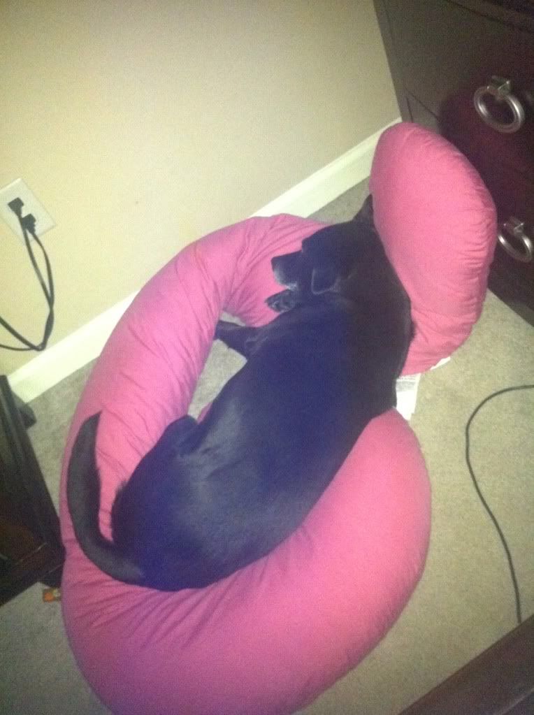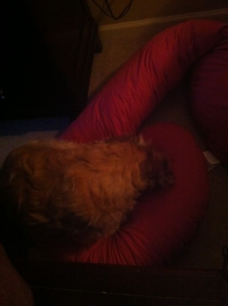 Totally unrelated, but I've been trying to sit up a little more while I'm sleeping so my sinuses won't drain and choke me all night, so I haven't been sleeping with my Snoogle. My two furbabies are liking that I can't sleep with it.