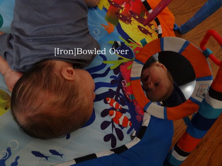 Accomplishments: Besides sleeping for 6.5 hours straight [once], you are holding you head up for 30-45 seconds at a time. You are also obviously able to see a little better now- you concentrate on anyone who speaks to you and are enthralled by your reflection and colorful lights.