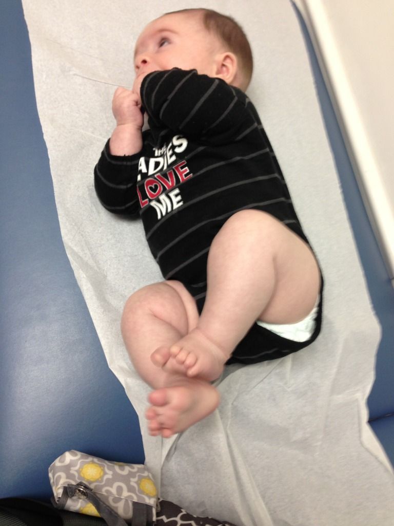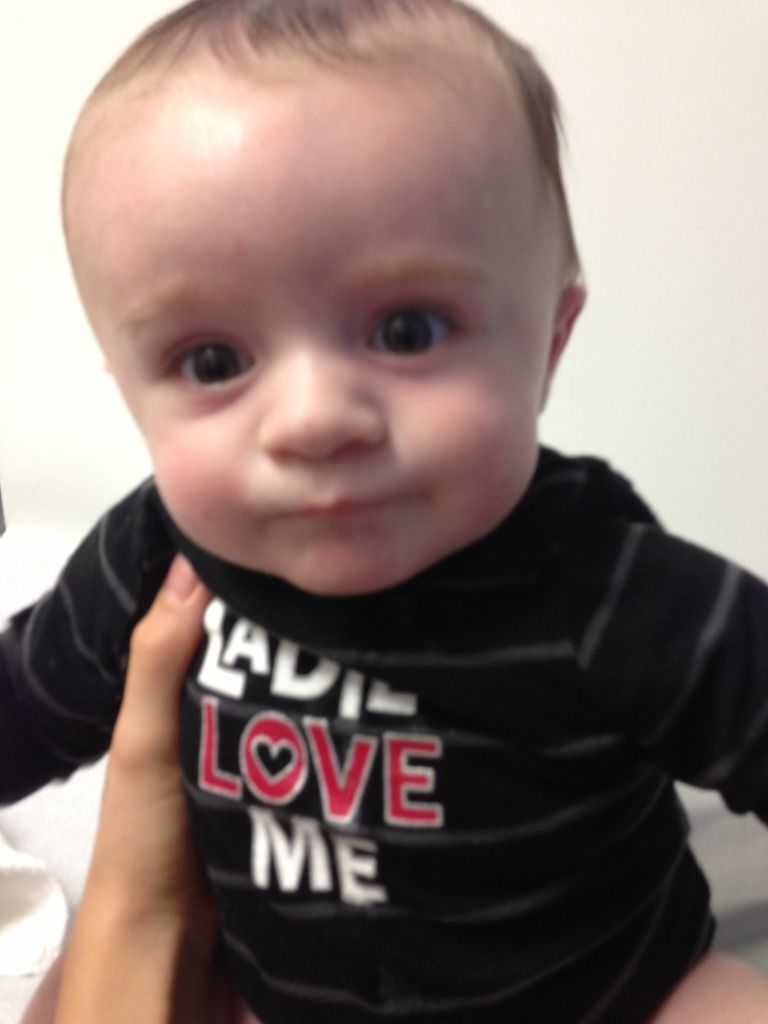The whole three stinkin' hours (that's for another time) we were there, he charmed the nurses, as per usual. We were in a waiting room alone for roughly an hour and a half (ugh) and we kept a good rapport going. In fact, it got so lively that nurses came in to listen to him talk. They gathered around when they realized a 3-month-old was already saying "Mama." I'm not sure anybody believed he was sick!